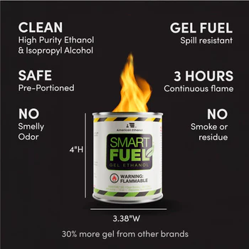 SMART FUEL Isopropyl and Ethanol Gel Fuel for ventless fireplaces is your best choice for both indoor and outdoor use.